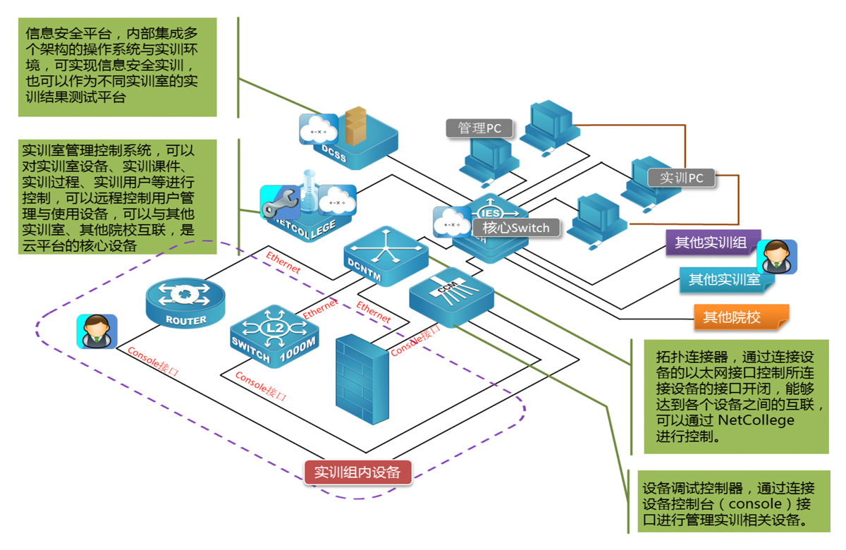配合Netcollege实验室管理软件,管理员或教师用户自由调整基于网络拓扑连接器管理的实验设备的连接,实现拓扑管理。学生用户顺利获得Netcollege实验室软件进行相关实验操作。