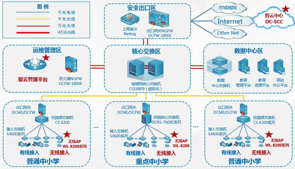 智云管理平台:部署在无线城域骨干网(一般指教育局机房)中,作为城域网统一管理平台,能够将人&网络统一管控,同时与智云中心业务承接相关云业务。